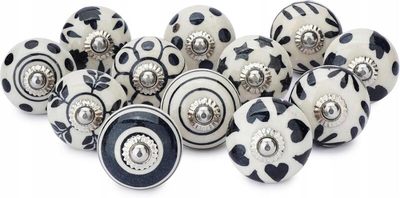 Dekoratív Fehér-fekete Fényes Kerámia Gombok 12 Db-os Szettben Szekrényekhez (AJJ-1020E3)ALLEGRO